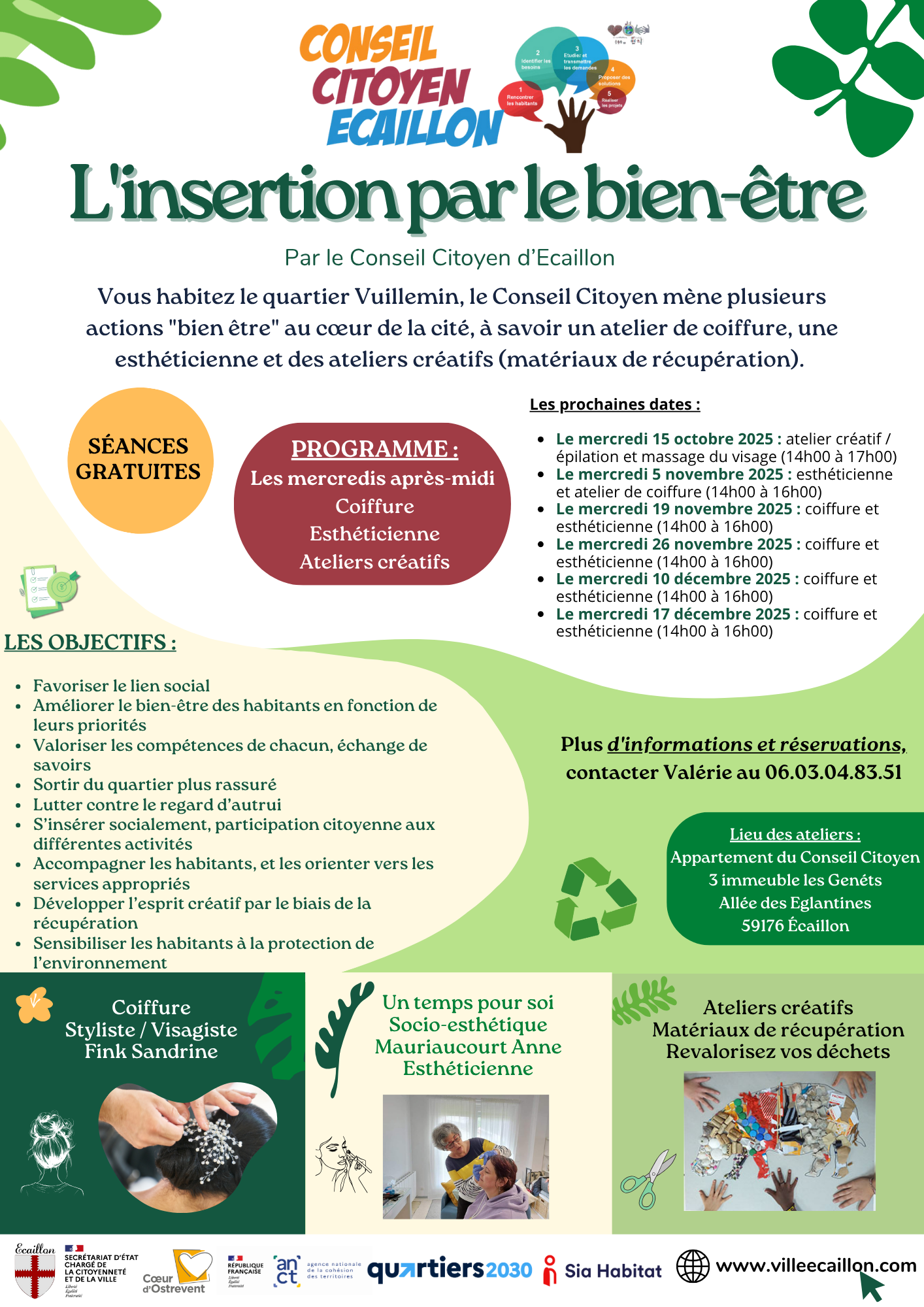 Le Conseil Citoyen d'Ecaillon toujours en concertation avec les habitants et bien évidemment avec le soutien financier de la Mairie et de l'Etat, envisage de poursuivre la mise en place dans l'enceinte de leur local, mis à disposition par SIA au cœur du Quartier Vuillemin, la reconduction des ateliers de socio esthétiques et de coiffure.