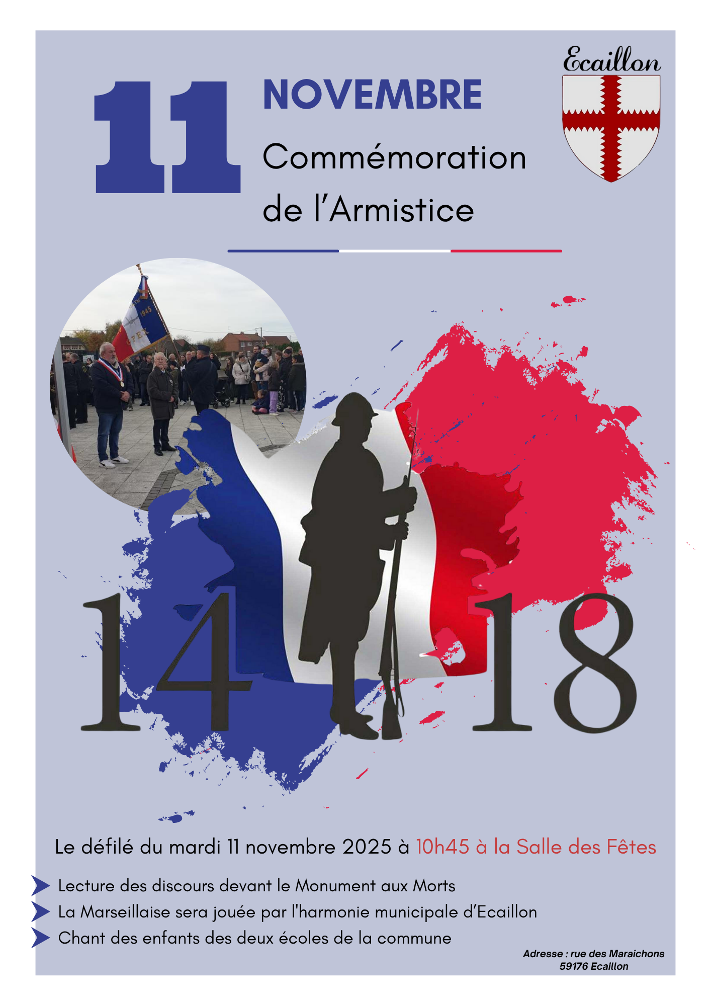 Place de la Mairie, rassemblement de la Municipalité, des anciens combattants, des associations écaillonnaises, de l'harmonie municipale et des enseignants et élèves des écoles.